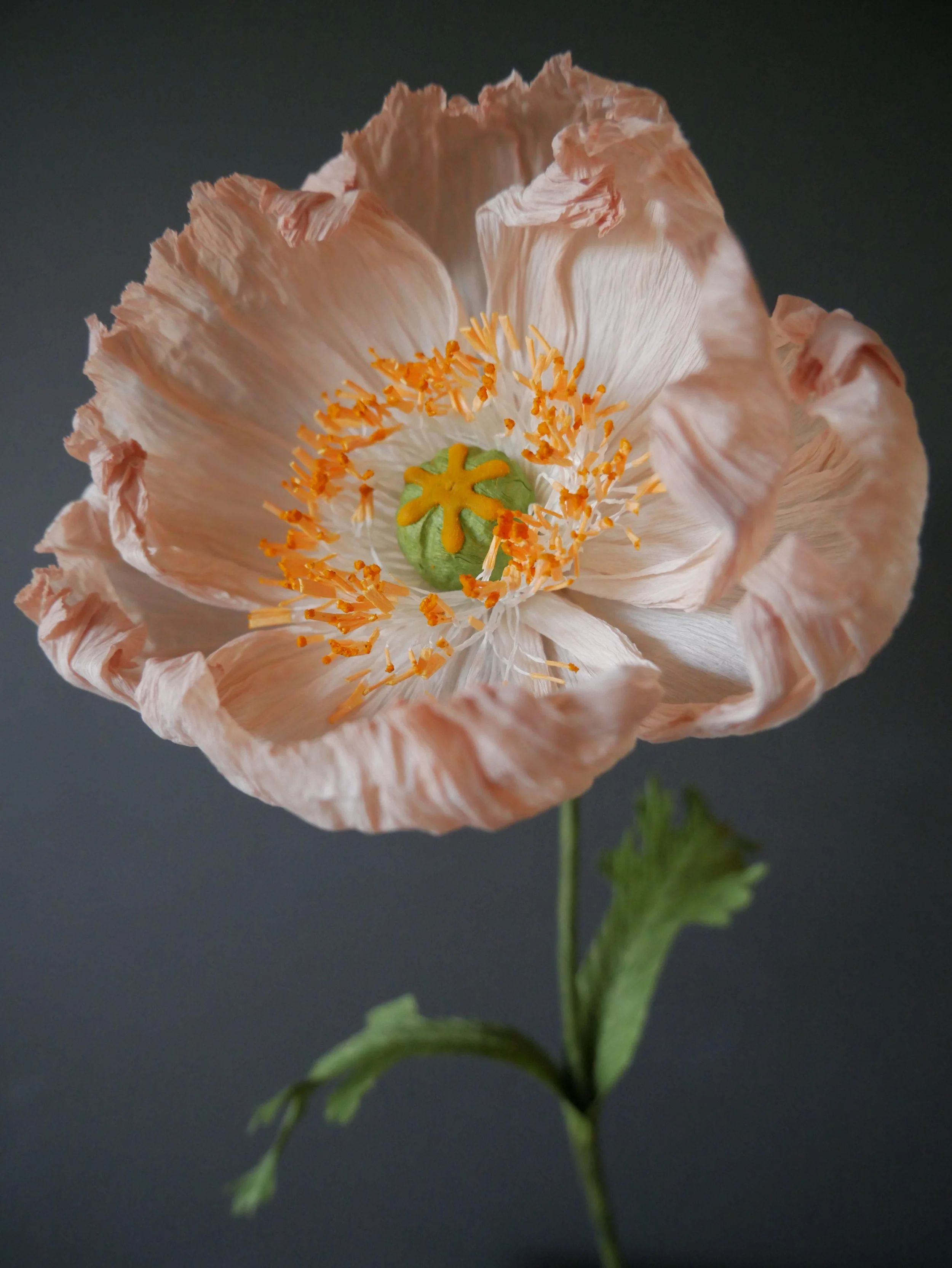 Photo 1 - Poppy & Bud (2024) Crepe paper, hand-dyed with avocado dye, & mixed media - An exploration in paper and movement in the different stages of bloom.